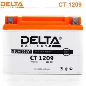 Герметизированный необслуживаемый VRLA cвинцово-кислотный стартовый аккумулятор Delta CT 1209 напряжением 12В и емкостью 9Ач. Обладает стартовым током в 135А. Полярность - прямая (+ -). Аккумулятор соответствует следующему коду YUASA: YTX9-BS, YTX9. Разработан специально для пуска двигателей мототехники. Изготовлен по технологии AGM (с микропористым заполнителем, пропитанным электролитом) из негорючего ABS пластика. Срок службы аккумулятора достигает 3-5 лет. Высокая стартовая мощность и повышенная энергоотдача. Адаптирован к Российским условиям эксплуатации.