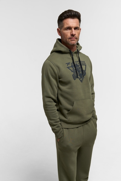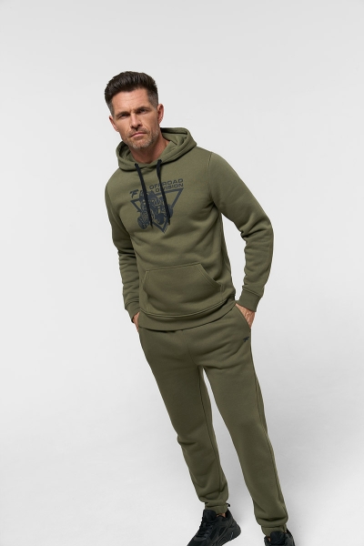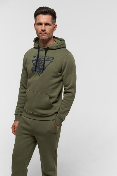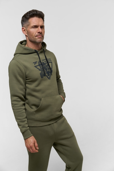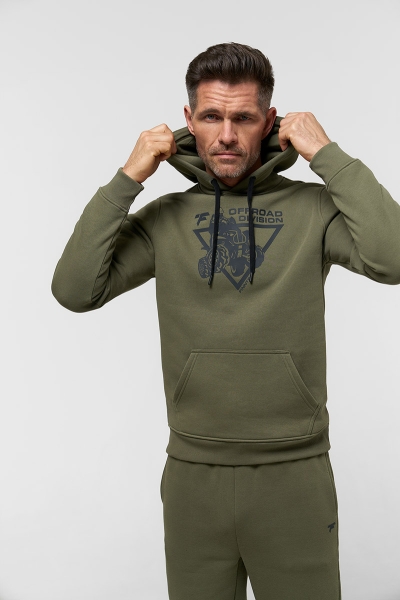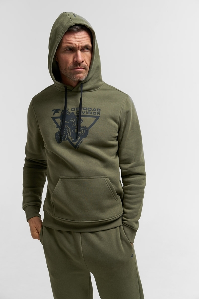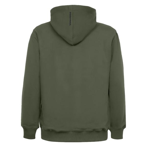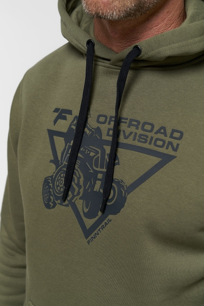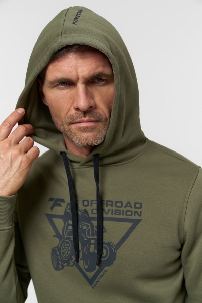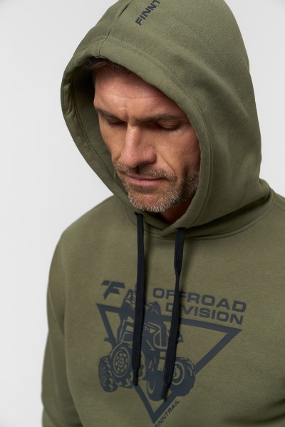 Классическое худи из футера с начесом 320 гм2 в цвете хаки. Объемный силуэт с накладным карманом и капюшоном, регулируемым шнурком. На груди нанесен крупный фирменный принт Finntrail в стиле ATV для любителей квадроциклов и езды по бездорожью. Так же небольшой логотип Finntrail дополнительно есть на капюшоне. Эластичные манжеты и низ изделия делают эту толстовку ещё комфортнее.