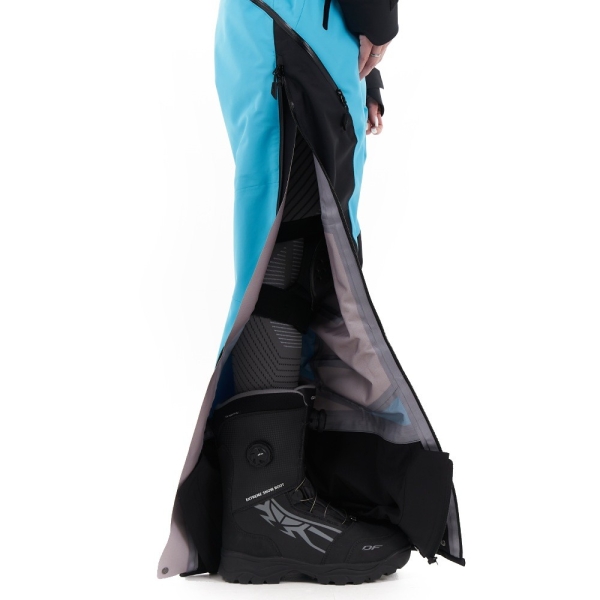 Комбинезон максимально облегающий, спортивный, с утяжкой на поясе. Безупречная посадка обеспечивается кроем деталей на лазерной установке (исключены ошибки ручной резки). Применена максимально удобная система вентиляции: сверху – на груди/спине, на штанах – во внутренней части бёдер. Высокие боковые молнии с тремя замками позволяют удобно надевать защиту коленей и ботинки, при необходимости их также можно использовать как дополнительную вентиляцию. Аккуратный капюшон с жестким козырьком и тройной регулировкой отстегивается. Ворот высокий, комфортного кроя, ткань внутренней части ворота мягкая и не натирает кожу. Рукава снабжены утяжкой на липучке, внутри имеют манжеты с прорезью для большого пальца. Есть петля для тангенты рации, два кольца D-ring, в нагрудном кармане – салфетка на резинке для протирания маски. Комбинезон имеет пять внешних карманов (в том числе для ски-пасс) и один внутренний утепленный карман для телефона с пленкой smart touch (через нее можно управлять экраном смартфона).