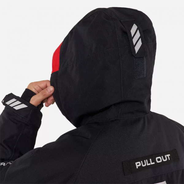- Капюшон, регулируемый по объёму в двух плоскостях, защищает от ветра и осадков.