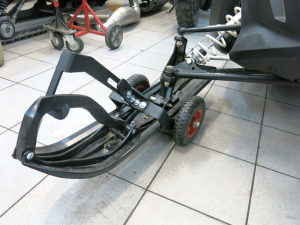 Разместите тележку под лыжей и приподнимите лыжу при помощи рукоятки. После этого заведите снегоход и перевезите его в нужное место.